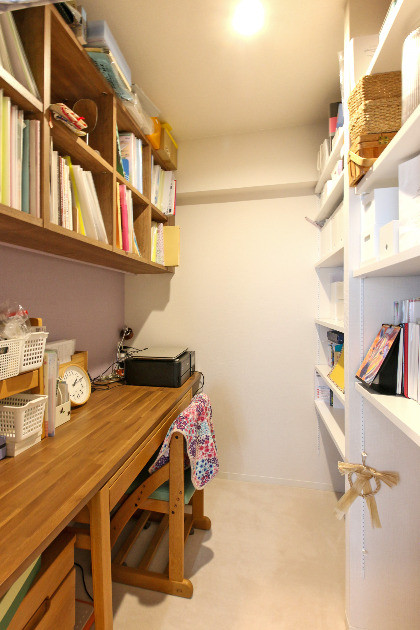 長さのあるカウンターに背面にはいっぱいの収納を造作し、お仕事で使われる書類など一式を収納できるように。