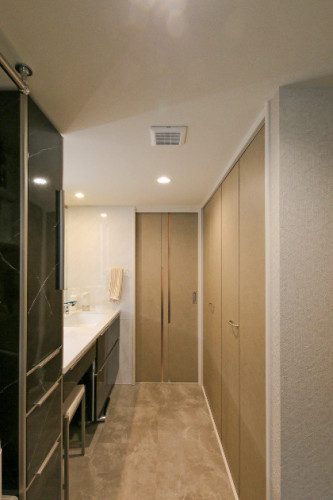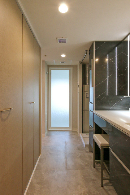 洗面化粧台の背面の収納はサイズも変えず扉を交換して空間に統一感を