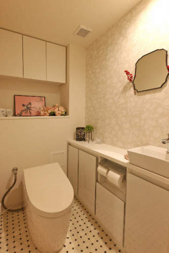 手洗い取付面には元々お持ちだった鏡に合わせて、ローラアシュレイのアクセントクロスをセレクト。