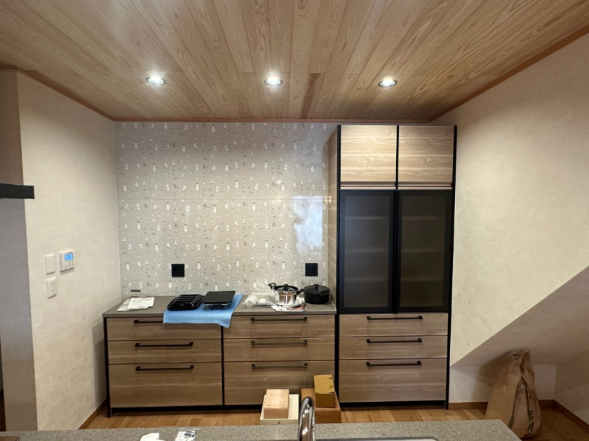 キッチンとカップボードを同シリーズで揃え、空間に一体感を演出。背面のムーミン柄パネルが、日々の家事に癒しを添えてくれます。
