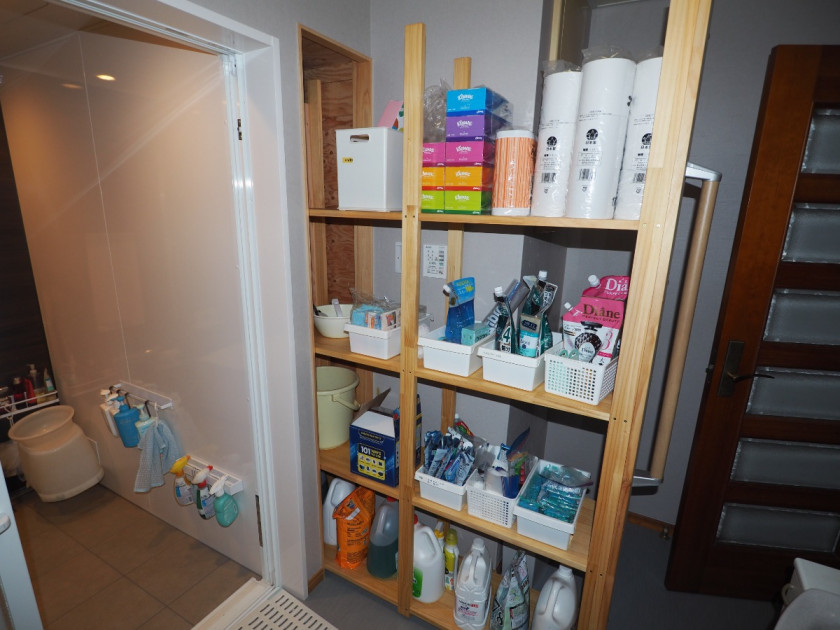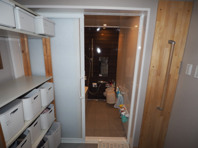 1616サイズに小さくしたので空いたスペースにW300×D1500のスライド収納と脱衣場に大きめの収納棚を造作で作りました。