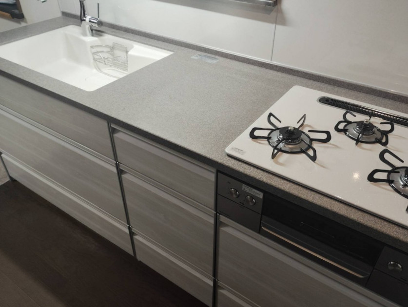 キッチンカラーは淡いホワイト系の色味に、繊細な木目模様が優しい印象の”ホワイトアッシュ”。ワークトップは”モデレートココア”を使用。ナチュラルモダンな上品なキッチンです。