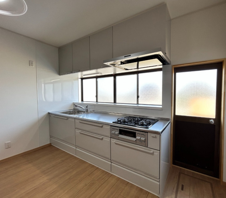 キッチン本体色はライトグレーで明るくなりすぎず、落ち着いた雰囲気に。