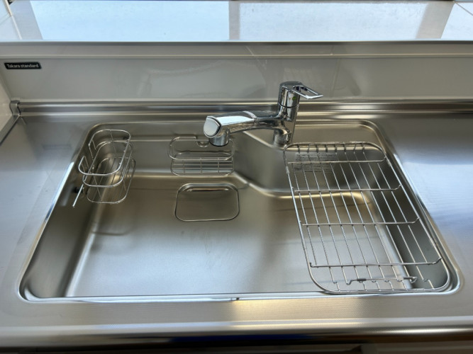 シンクは「らくエルシンク」というタイプで左奥のバーに小物置きやゴミポケットを好きな位置に掛けることができ、