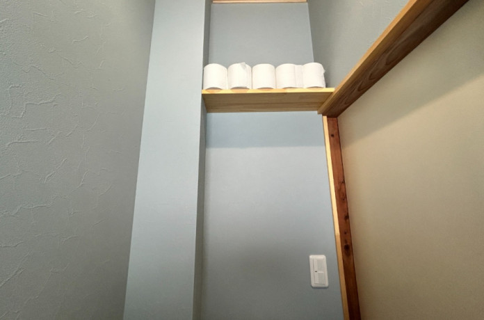 入口上部へ棚を取り付け、すっきりさせながらストックの収納を確保しました。