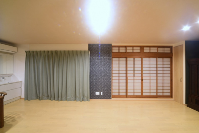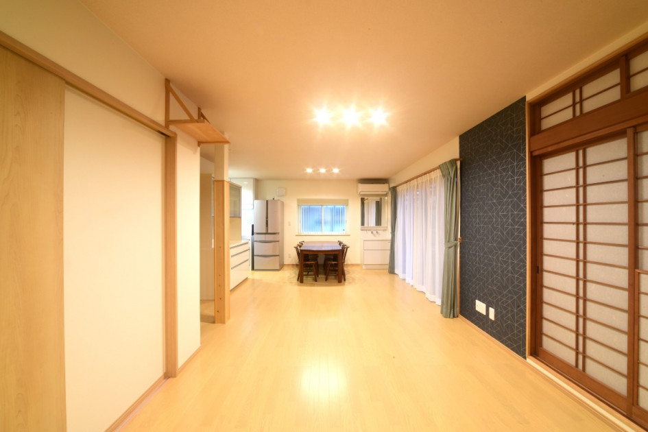 リビングと和室の仕切りを取り一部屋のLDKにしました。アクセントウォールはTVSPです。