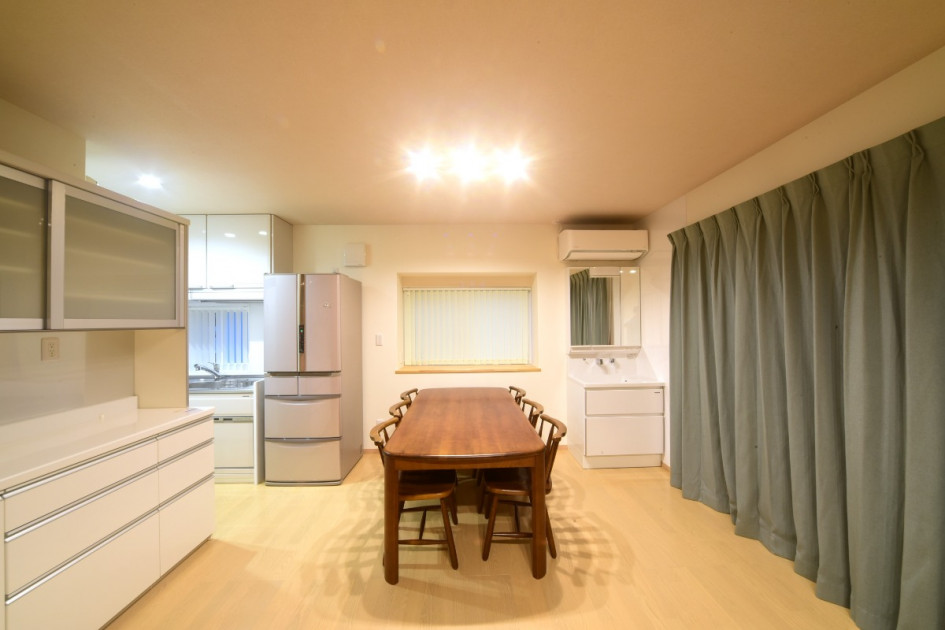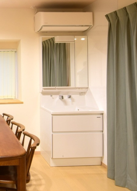 脱衣室は脱衣と収納家具を優先して、洗面台はダイニングSPに出しました。ご自分が帰って来た時やお孫さん達が来た時手を洗うとか、食事の後の歯磨きなど、近くで意外にとても便利と喜んでいただきました。お掃除のときにも便利と言って頂きました。