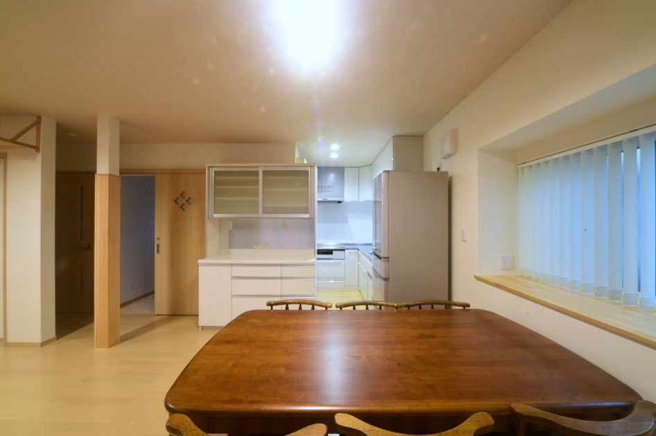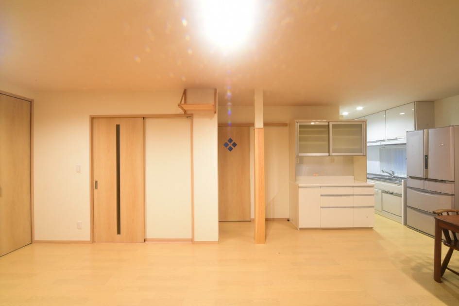 対面キッチンを最初は希望されていましたが、リビングがやや狭くなるので、お孫さんや息子さん夫婦が来た時に居場所が狭いので、キッチンパントリーを止めL型キッチンで収納を増やすことにしました。また、ダイニングとの繋がりも動線に無駄がなく、部屋も広くなるので改修方向は決まりました。キッチン収納は広いと無駄も多くなるので、普段2人に見合った収納でいいのではないかと説明して納得して頂きました。その代わりの収納は床の間を無くし、仏間を小さくすることで確保しました。