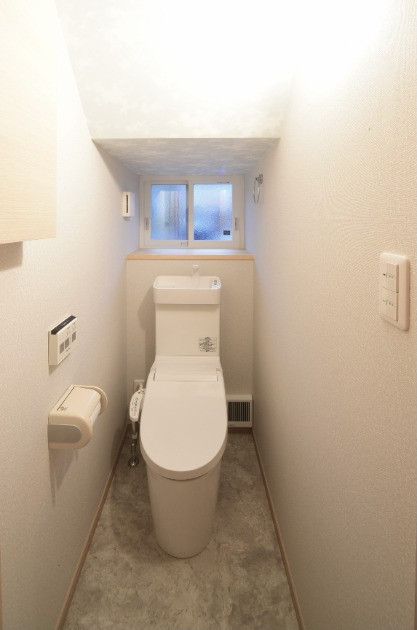 奥にカウンターを設けて、斜め天井下に便器を移動して高さを確保しました。天井が高くなっいたので、床はLDKと平らには入れるようにバリアフリー化しました。