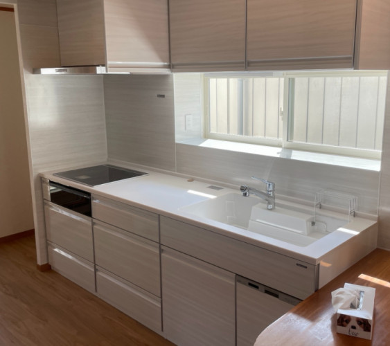 広々とした作業スペースと多機能な収納を備えた最新のシステムキッチンにリフォーム。