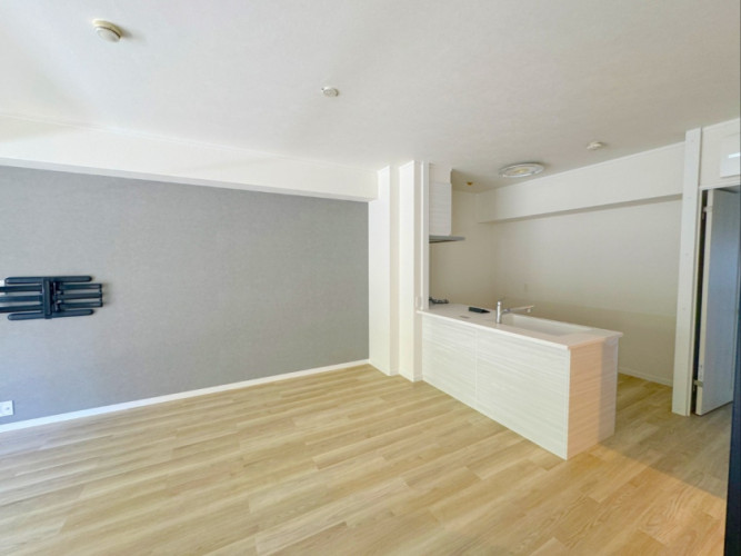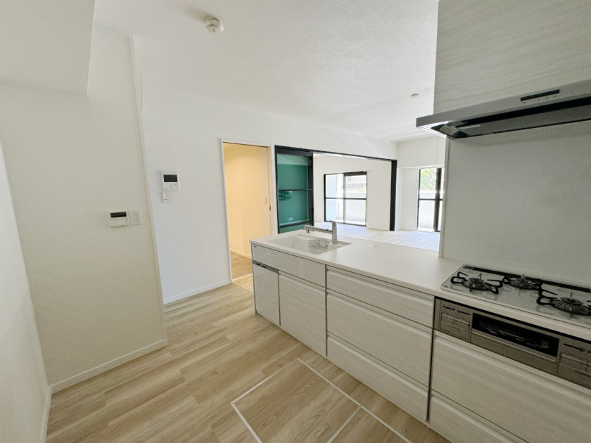 キッチンと廊下、リビングの間仕切り壁、対面吊戸棚をなくし、抜け感のある開放的な空間にリフォームしました。