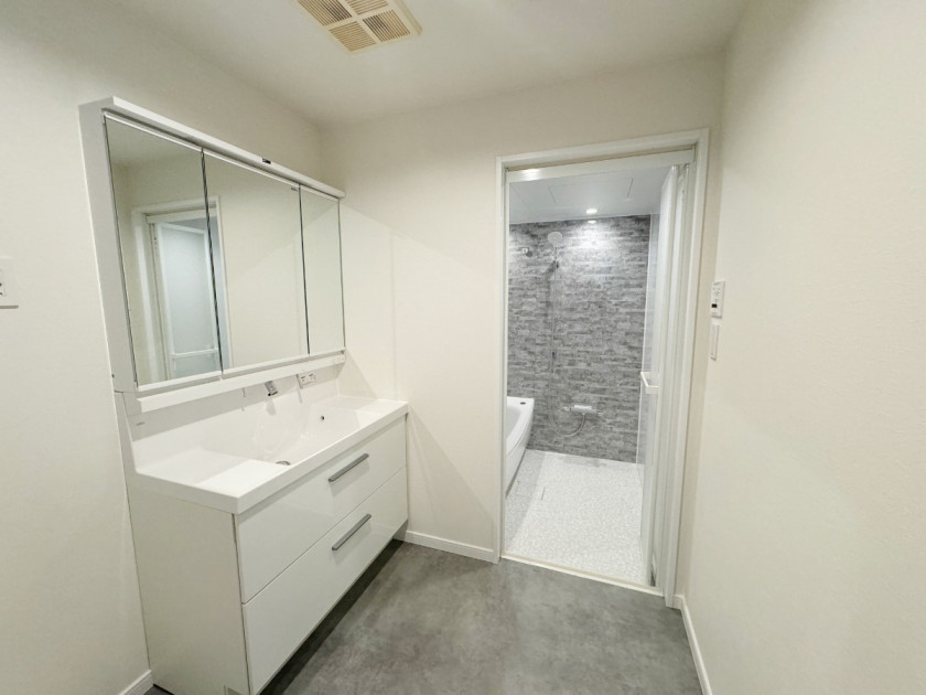 洗面化粧台はLIXILのEVシリーズを設置しました。三面鏡の収納のほか、下台の引き出し収納も充実しており、生活感を抑えながらスッキリと整理整頓できます。明るく広がりを感じさせる設計で、朝の準備や帰宅後の手洗いが自然と気持ちよくできる空間です。扉・天板もお手入れしやすい仕様で、長く快適に使い続けることができます。