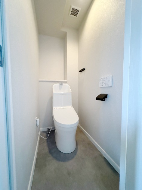 白を前面に出した清潔感のあるデザインのトイレに、シックなグレートーンの床、ブラックのトイレットペーパーホルダーや小物置きがアクセントとなり、落ち着いた雰囲気のトイレリフォームとなりました。