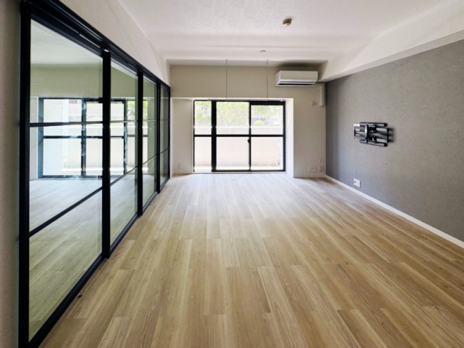 ブラックフレームの室内建具は空間のアクセントにもなっており、全体のトーンを引き締めながらも、抜け感のある印象を与えてくれます。