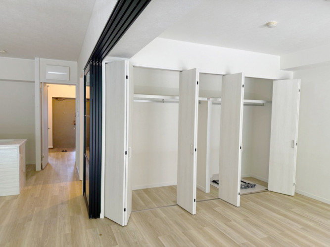和室は解体し、リビングと合わせてフローリングにしています。壁一面を広々としたクローゼットにすることで収納力がアップしました。