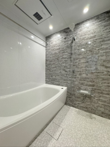 浴室は、TOTOの「マンションリモデルWYシリーズ」を採用しました。石目調のアクセントパネルが印象的な浴室は、コンパクトながらも洗練された印象があり、空間全体がホテルライクな落ち着きに包まれます。滑りにくく乾きやすい床材、手元で操作しやすいシャワーや水栓の配置など、安心感と快適さの両立を意識しています。