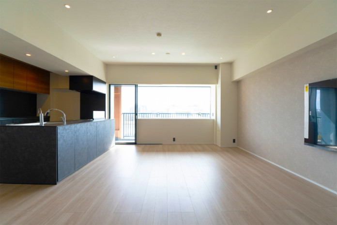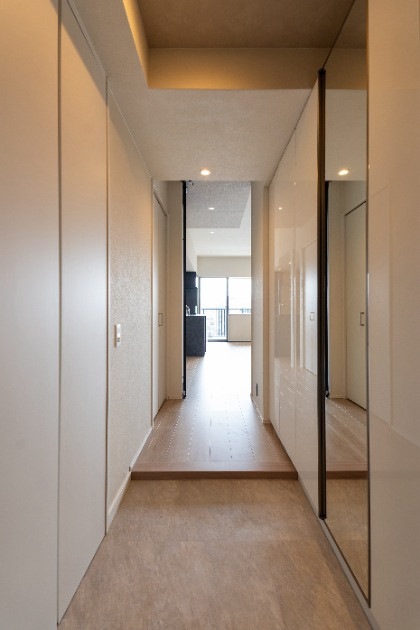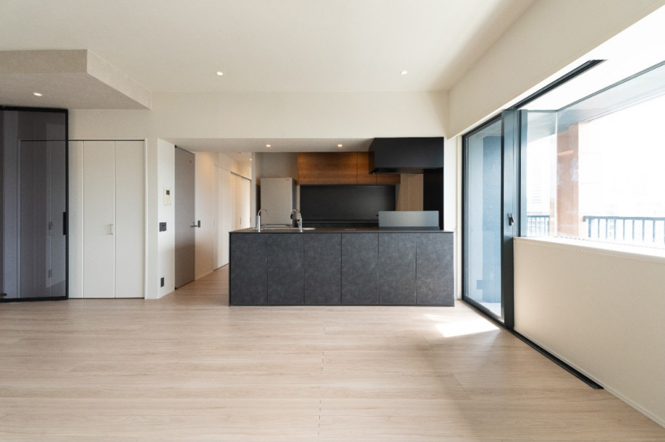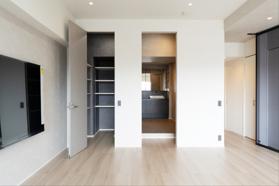 床にはナチュラルなトーンのフローリングを新たに採用。光をやわらかく反射し、空間を広く見せる効果があります。洋室やリビングはベージュ〜グレートーンのクロスと相性良くまとまり、統一感のある室内へ。クローゼットは折れ戸式で内部も整理しやすく、収納力を確保しながら見た目にもすっきりとした仕上がりに。建具やガラス扉などのパーツもマットブラックで統一され、空間全体にモダンな印象を与えています。