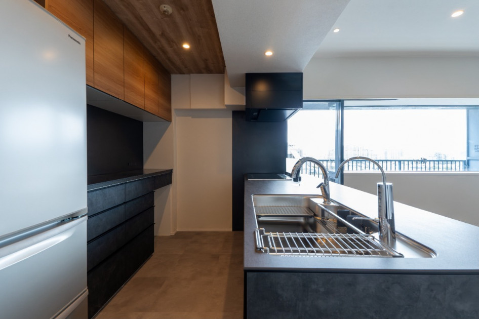 扉面材にセラミック調カラーを採用し、落ち着きのあるシックな雰囲気に仕上がったLIXILの「リシェルSI」。作業スペースは広く、カウンターも高級感のある素材感が特長です。吊戸棚や背面収納との色のバランスも考慮し、空間全体がまとまりのある印象に。収納力・清掃性・耐久性すべてにおいてバランスのとれたキッチンです。