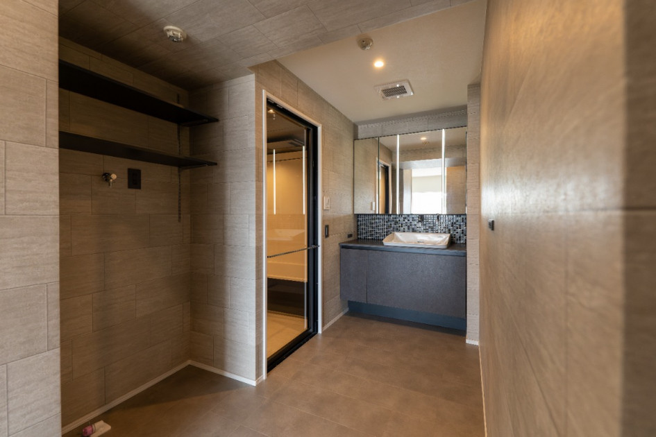 洗面台はLIXILの「ルミシス」をハイバックベッセルタイプで設置。重厚感のあるカウンターと、シンプルながら個性のあるボウルデザインが印象的です。三面鏡には照明も内蔵され、身支度の時間も快適に。背面にはモザイクタイルが施され、素材感のある空間づくりがされています。収納棚も造作風に設けられており、空間に溶け込んでいます。