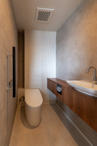 TOTOのネオレストAS2を採用したトイレは、洗練されたデザインと機能美を兼ね備えた空間に。床・壁ともに落ち着いたトーンで統一されており、間接照明の効果も相まって柔らかく上質な印象に仕上がっています。カウンタータイプの手洗い器や壁面収納もすっきりとまとまり、清潔感と利便性の高い設計です。