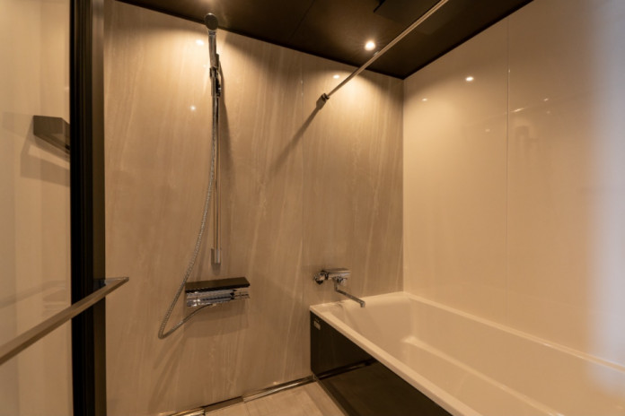 浴室はタカラスタンダードの「グランスパ」を採用。ダークトーンの天井と壁、やさしいベージュの床面が上品に調和し、くつろぎの空間を演出しています。ぬくもりを感じる石目調パネルにより、見た目にも温かく、ホテルライクな印象に。もちろん、お掃除のしやすさや断熱性といった基本性能もしっかりと備えています。