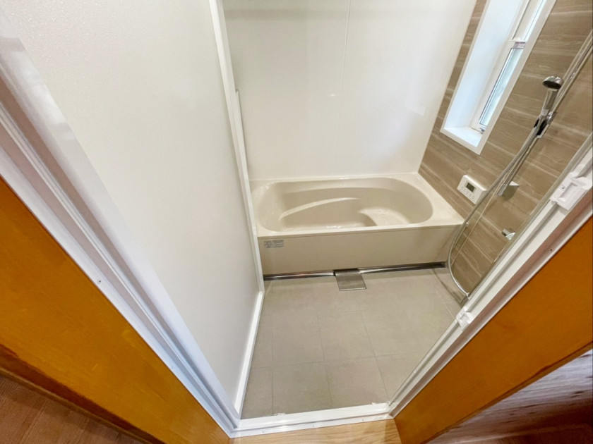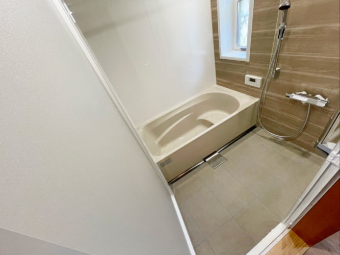 床・壁や浴室ドア枠、浴室内窓などお風呂空間をまるごとリフォームです。こちらはベンチ付きラウンド浴槽でゆったり座って半身浴もできる浴槽になっています。シックな色合いの壁と床、お手入れしやすいキープクリーン浴槽・キープクリーンフロアで家族みんなが毎日快適なお風呂時間になるリフォームになりました。