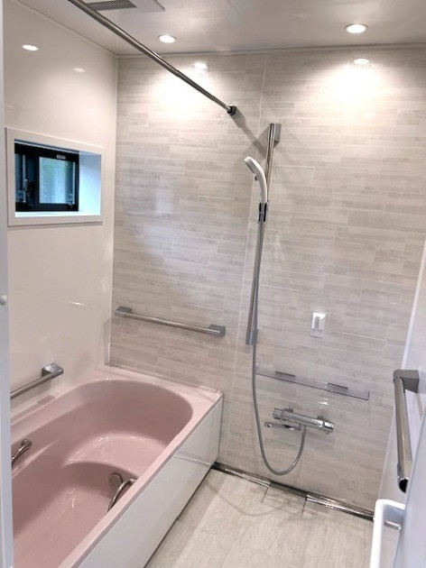 グランスパで浴槽の色は奥様の好きなピンク色です。手すりの数も増やして床材もツルツルのタイルから滑りにくい材質のものに、見た目も安全性も質感も兼ね備えたリフォームになりました。