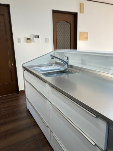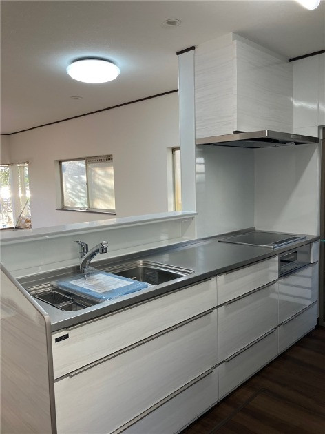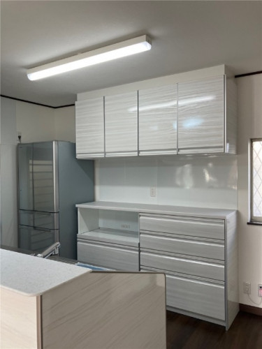 上部の壁付け収納を取ることによりキッチンとリビングが広く感じられ、明るい色のシステムキッチンと食器戸棚でお部屋の印象が明るくなりました。