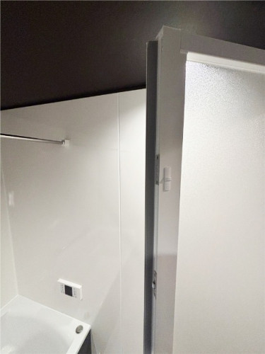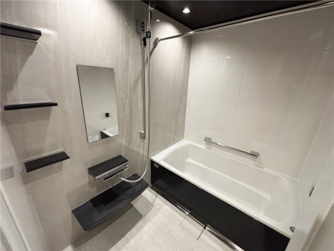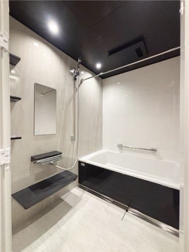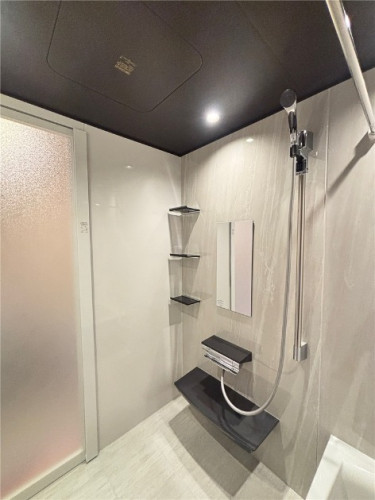 こまめにお手入れされていたため全体的にきれいでしたが、経年劣化による汚れが気になるようになってきたとのことでした。そこで今後を見据えてよりお手入れしやすい浴室へとのご要望をいただき、汚れや傷がつきにくい素材を使用したタカラスタンダード「グランスパ」をご提案。マグネット式の壁で収納も自由に取り外しでき、お手入れのしやすさが格段に向上しています。また照明をダウンライトにしたことで空間がすっきり。奥様のご希望で天井は黒色を採用し、ラグジュアリーで落ち着いた雰囲気に仕上がっています。