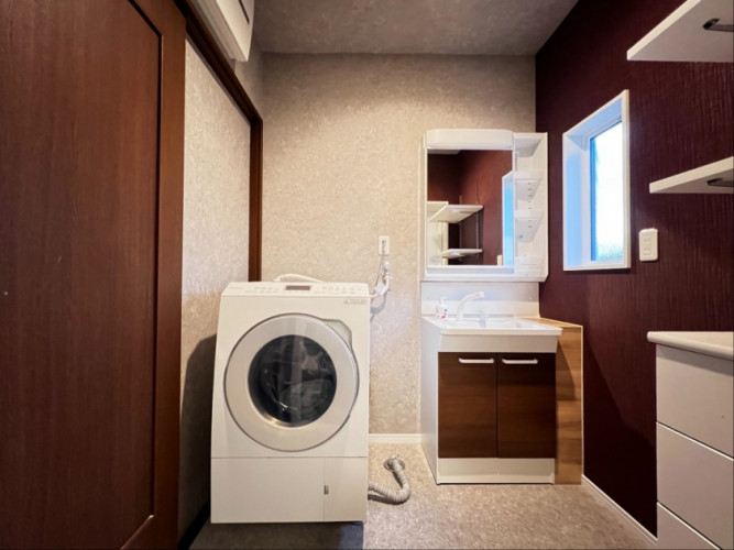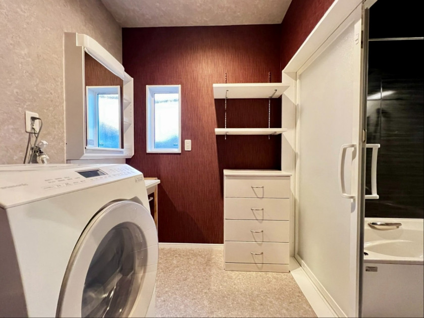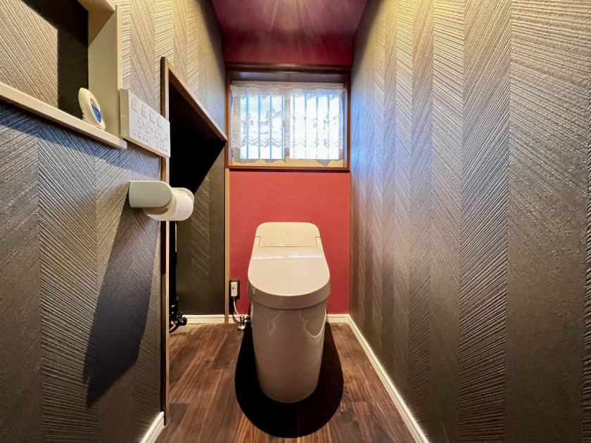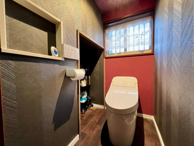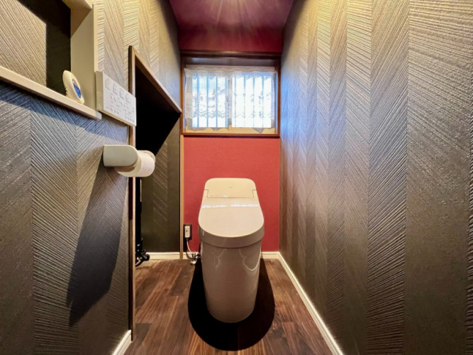 提案いただいたときは、壁紙にこんな暗い色や赤を使って、派手すぎないか?と不安もありましたが、完成を見て感動しました。お風呂はまるで高級ホテルのようですし、トイレも洗面所も『自慢したい場所』になりました。