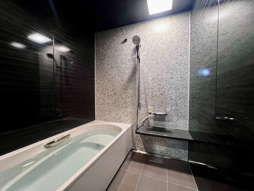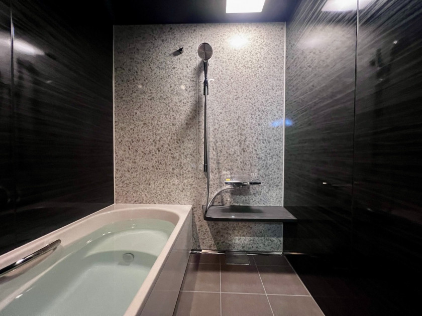 正面をシックな石目調パネルを採用され、3面にパールブラックと高級感と落ち着きのある「大人のバスルーム」をご提案させていただきました。
