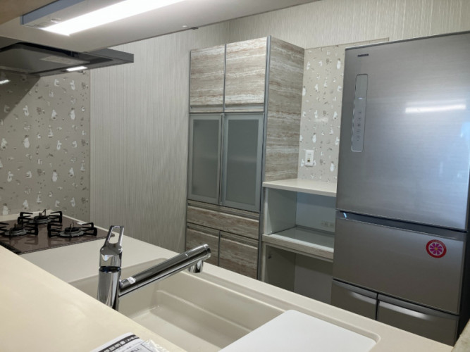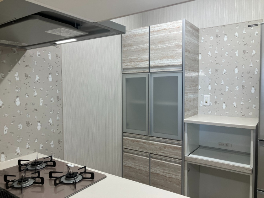 新しいキッチンは引き出しタイプになった他、食器棚からウォールキャビネットに入れ替えた事で収納力が格段に上がりました。ウォールキャビネット横には、レンジや炊飯器を引き出せる周辺ユニットを併せて設置しています。予め置きたい家電を確認して打合せしたので、コンセントを新しく作り配線もすっきりと収まっています。