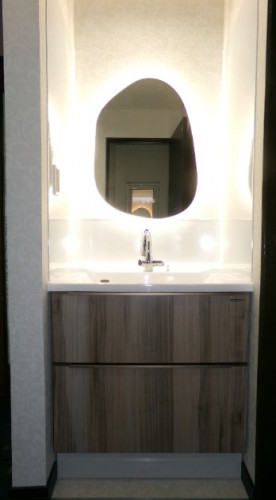 洗面鏡は調色ライト付きの製品をお施主様にご用意いただき、まるでモデルルームのようなおしゃれな空間になりました。
