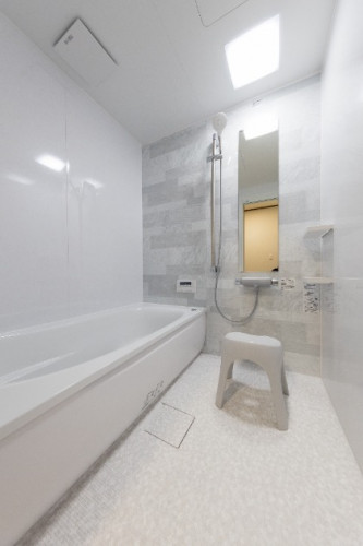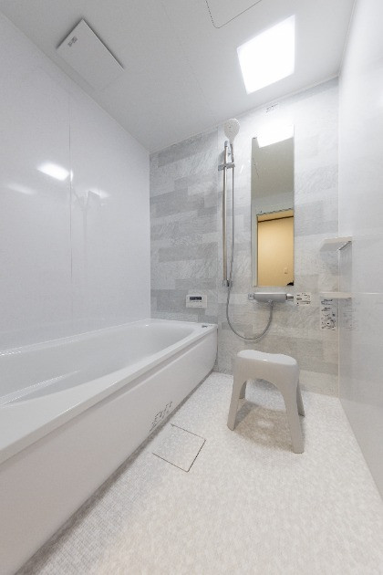 トイレ空間の見直しで生まれた余白を活かし、広いバスルーム実現。窓を思い切って無くすことで断熱性能を高めたくつろぎ空間へと生まれ変わりました。