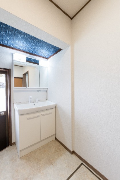 洗面台の向きを見直し、使いやすさがアップ。間仕切りをなくすことで、脱衣室もゆったりとした開放的な空間になりました。