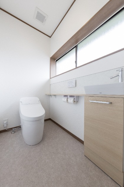 トイレの向きを変えてレイアウトを見直し、空間の有効活用を図りました。手洗いには水ハネ防止のパネルを設置し、清潔さと使いやすさにこだわりました。