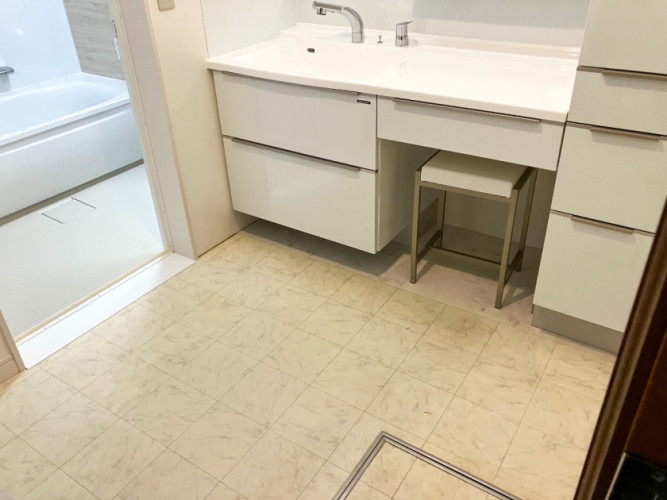 お風呂と脱衣室の段差もなくなりフラットに。ホワイトで統一した清潔感あふれる空間に仕上がりました。