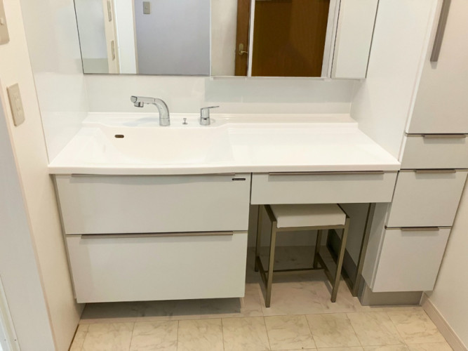 ドレッサーとしても使える洗面化粧台をチョイス。カウンター一体型なのでお手入れも簡単です。収納もたっぷりありますので、すっきりとした空間を保てます。