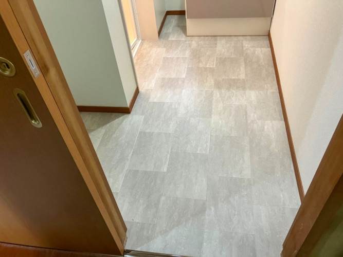 内装も一新し、グレーのコンクリート調クッションフロアが空間をぐっと引き締めています。洗練された印象に仕上がりました。