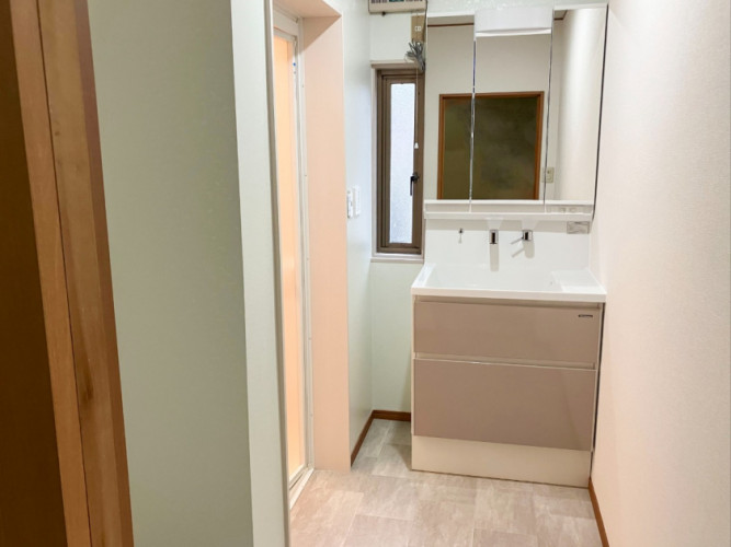 すっきりと収納できる三面鏡の洗面化粧台に一新。ハイバックタイプで水はねしにくく、お手入れも簡単です。収納は引き出し式で、奥の物まで見渡しやすく、使い勝手がいいとご好評いただいております。