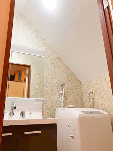 水栓周りの水はねが気になることからハイバックタイプの洗面化粧台をチョイス。壁紙にアクセントを取り入れて、明るく華やかな空間に仕上げています。