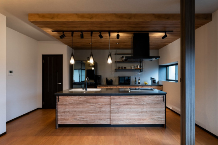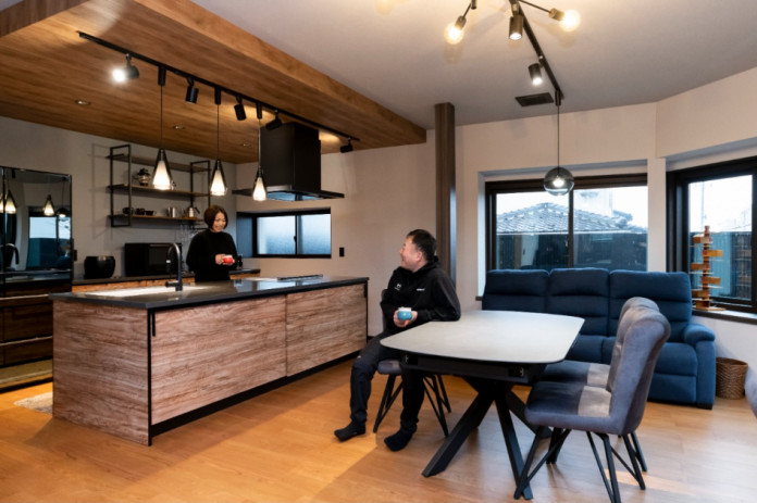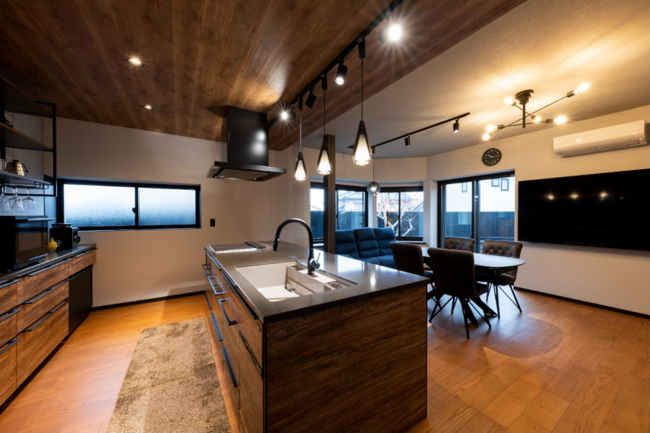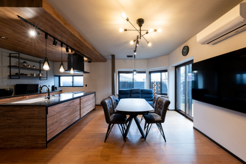 ご夫婦がショールームで一目惚れしたキッチン、ブラック×ウッドを基調としたクールな色彩に合わせて内装もコーディネートしました。