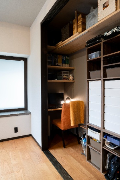 収納庫内にWii-Fiルーターを隠し、PCスペースに。生活感を排して家をすっきりさせる、使い勝手の良い配慮が散りばめられています。
