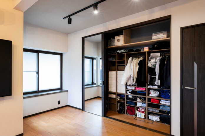 そして、すっきりとした空間づくりを念頭に置いてデザインされたLDKの一角、リビングに設けられた3枚引込戸の収納スペースには、中高生の子どもたちの荷物がひとまとめに。さらに収納庫内にWii-Fiルーターを隠し、奥様のPCスペースとしても利用できる設計となっています。