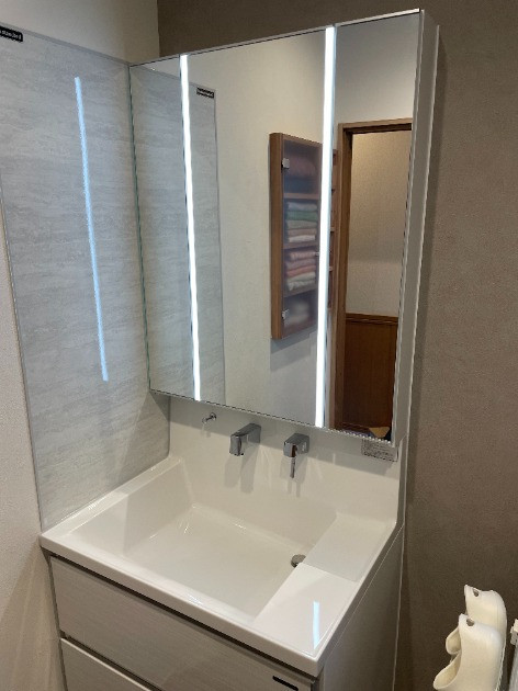 収納力と清掃性を重視した洗面化粧台にリフォーム。見た目もカッコよく、壁側のパネルにマグネット対応で使い勝手も良い、清潔感のある空間に仕上がりました。