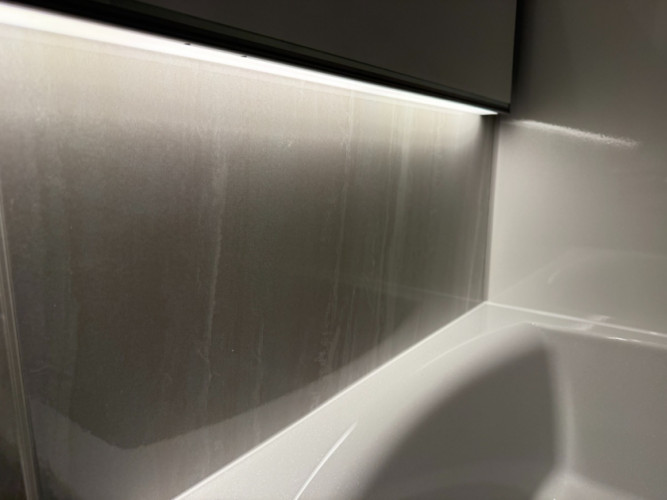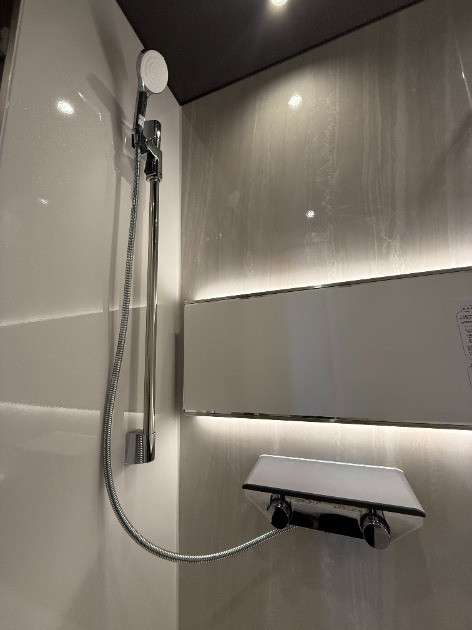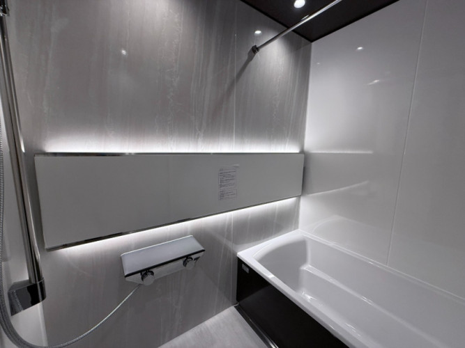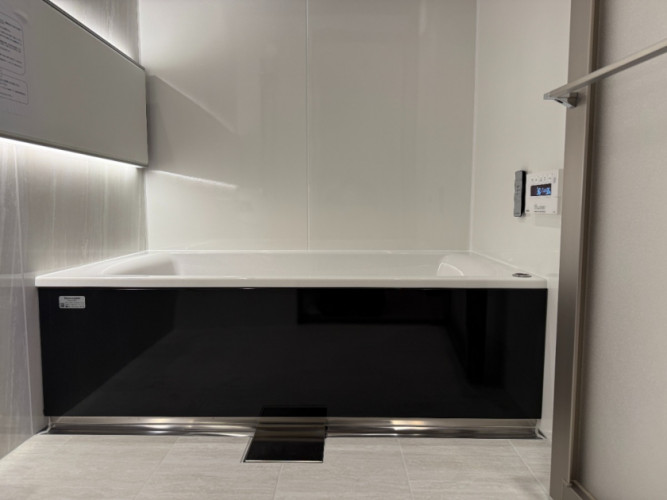 かっこいい大人の女性なお客様のイメージに合わせ、浴槽エプロン・天井・浴室乾燥機・ダウンライトをブラックにし、ラグジュアリーミラーで上質で洗練された空間をコーディネートしました。