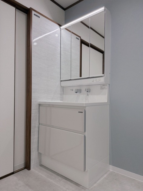 既存の洗面化粧台には壁側に背の高い収納がついており、そちらも洗面と一緒に撤去し、新たな洗面を左に寄せると左側への水飛びが気になりました。設置場所の左側は片引き戸がありましたので、新たに壁を作りホーロー洗面パネルの貼り付けを追加でご提案。