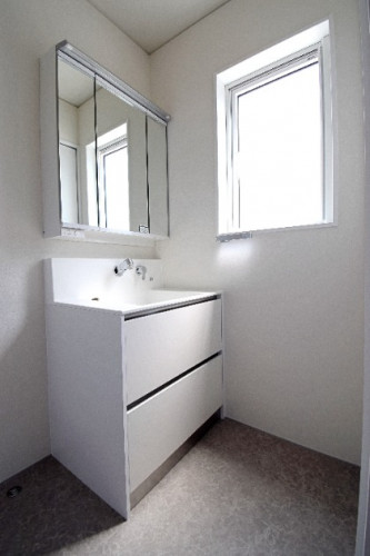 ミラーボックスと洗面台に多くの収納があり白を基調とした洗面台です。