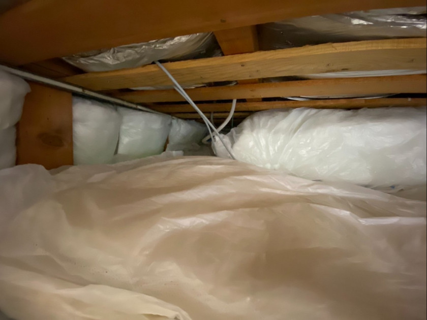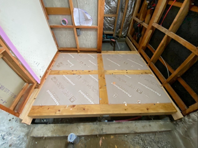 洗面脱衣室の床組みには、防腐・防蟻・防カビなどの対策として、ほう素系防腐防蟻エコボロンPROを施工