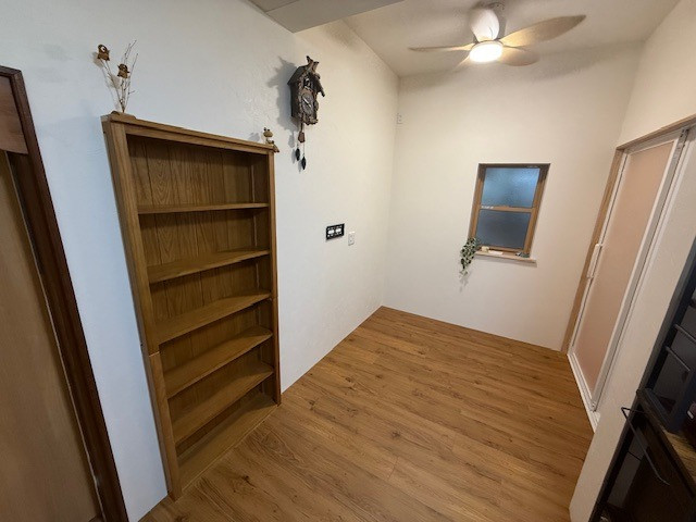 既存の壁を無くしお風呂として使用していた場所を脱衣場兼くつろぎスペースに天井も若干高くしプロペラ付シーリングライトで更にオシャレに!